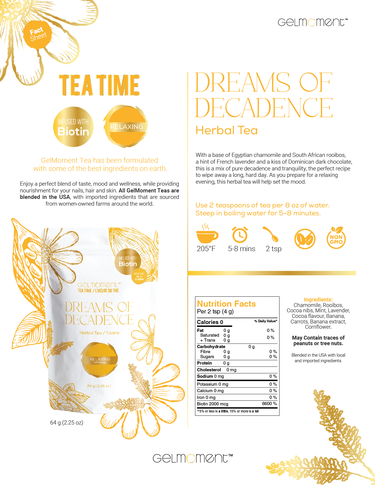 Chamomile, rooibos, cocoa nibs, mint, lavender, cocoa flavour, banana, carrots, banana extract, cornflower.